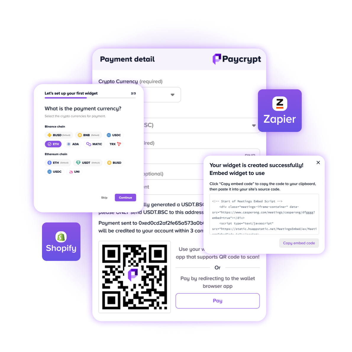The Crypto scan-to-pay widget brings convenience to retail stores and can be seamlessly integrated into Shopify and Zapier. It allows businesses to accept cryptocurrency payments effortlessly, providing customers with an alternative and efficient payment method. With its integration on Shopify and Zapier, businesses can easily leverage the benefits of crypto transactions and enhance the overall shopping experience for their customers.