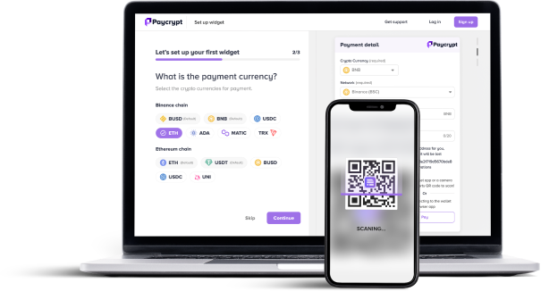Create an account to login Paycrypt, enter wallet address and select the crypto currencies for payment, simply integrate the service into your project by embed code.