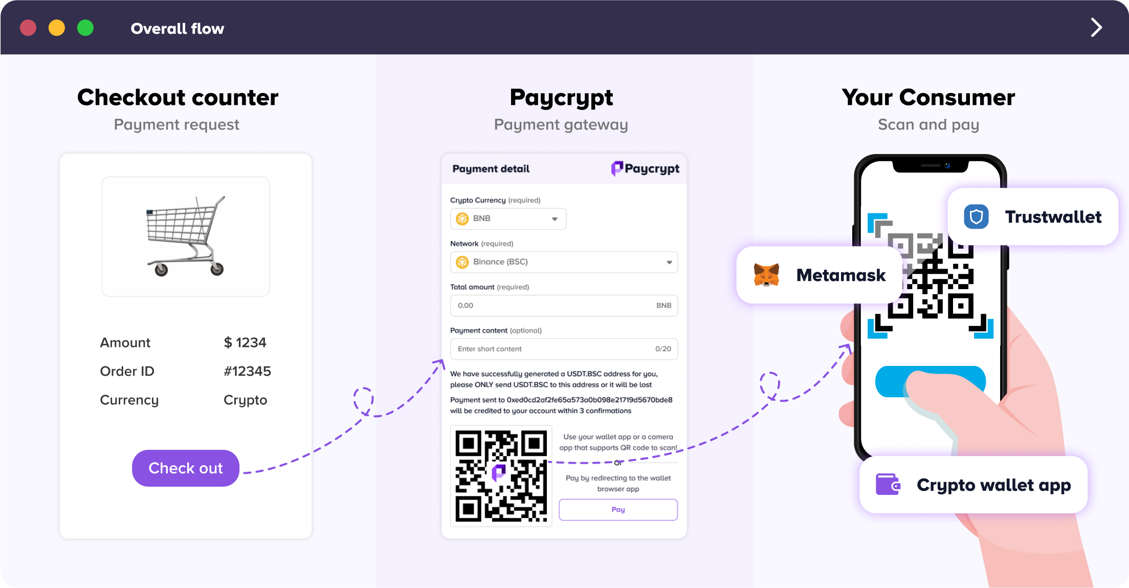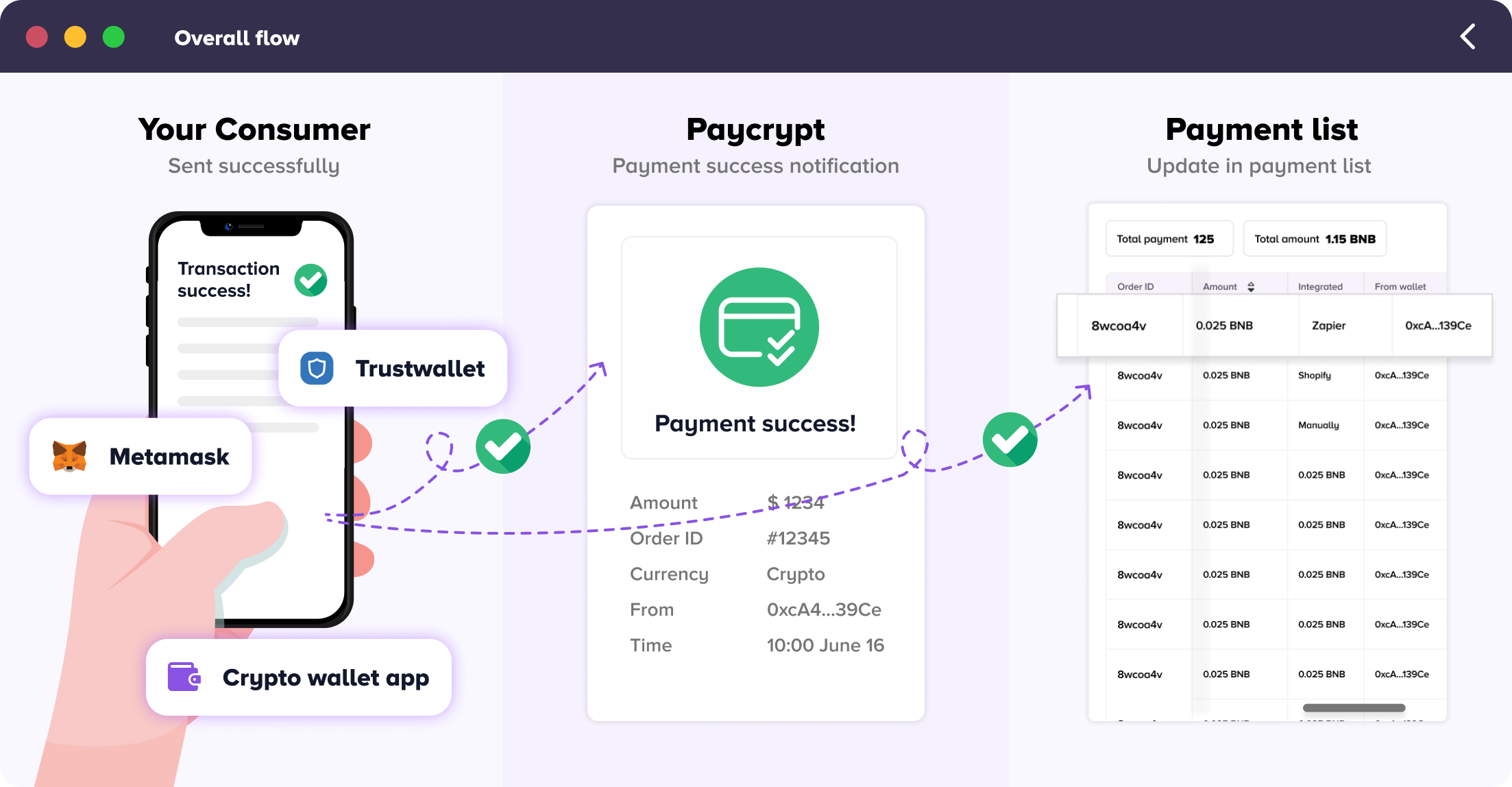We make it possible for consumers to pay with their cryptocurrencies by any crypto wallet